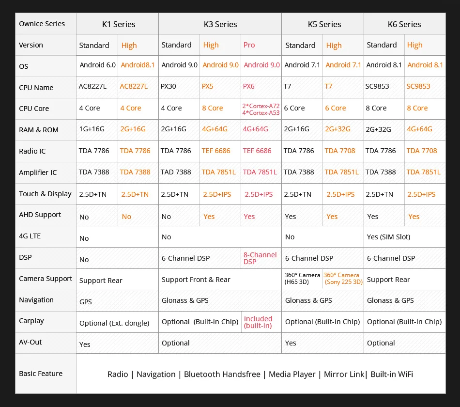 Ownice K5 & K6 series: SPDIF interface will be added on the mother board (from 20th August) to support Optical Audio Cable connected; External Microphone cannot be used because there is no plug on the back heat sink; TPMS only can be connected via USB port; AHD Camera supported.